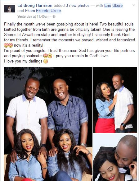 Sharing the goodnews on Facebook, Edidiong Harrison wrote: “Finally the month we’ve been gossiping about is here! Two beautiful souls knitted together from birth are gonna be officially taken! One is leaving the Shores of Akwaibom state and another is staying! I sincerely thank God for my friends. I remember the moments we prayed, wished and fantasized ðŸ˜�ðŸ˜� now it’s a reality!